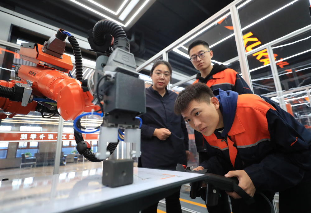 2024年11月22日,沈陽工學院電氣工程及自動化專業學生操作機器人進行物料碼垛實訓。近年來,沈陽以產業需求為導向,促進技術院校與知名企業共建高水平新型工業化實踐教學中心,構建校企協同合作推進產教深度融合,促進學生高質量就業。新華社記者 楊青 攝