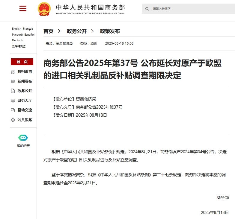 商務部公告2025年第37號 公布延長對原產于歐盟的進口相關乳制品反補貼調查期限決定