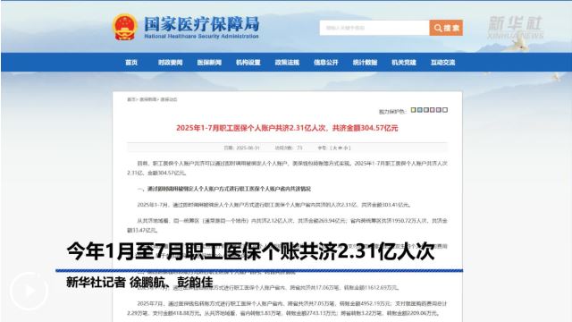 【簡(jiǎn)介】記者8月31日從國家醫(yī)保局獲悉,2025年1月至7月職工醫(yī)保個(gè)人賬戶共濟(jì)人次2.31億,金額304.57億元。