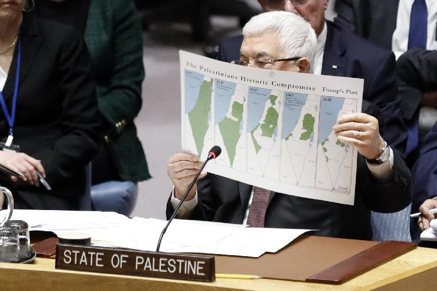 ??2020年2月11日,在位于紐約的聯合國總部,巴勒斯坦總統阿巴斯在安理會中東局勢和巴勒斯坦問題公開會上手持地圖發言。 新華社記者 李木子 攝