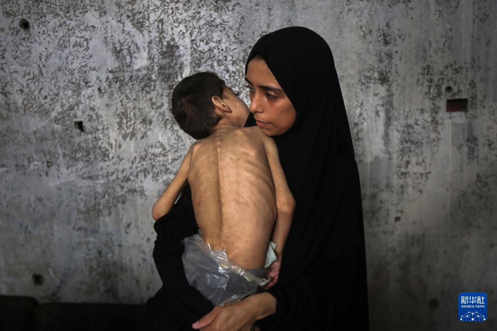 ??7月25日,在加沙城一處避難所,一名女子懷抱營養不良并患病的兒童。新華社發(里澤克·阿卜杜勒賈瓦德攝)