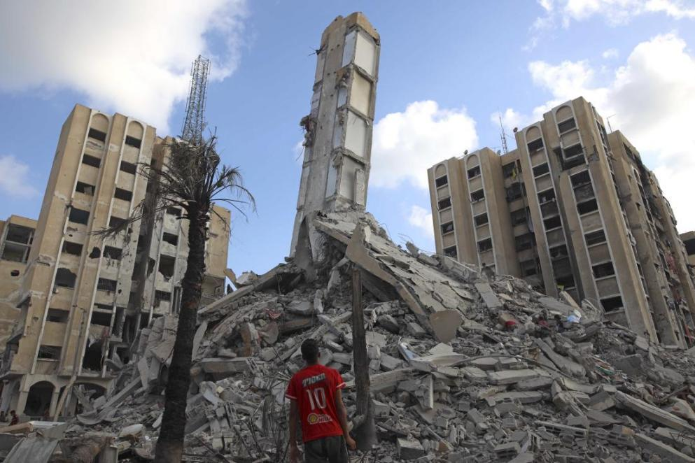 ??2024年7月26日,在加沙地帶中部努賽賴特難民營,一名男子查看一片建筑廢墟。新華社發(馬爾萬·達烏德攝)