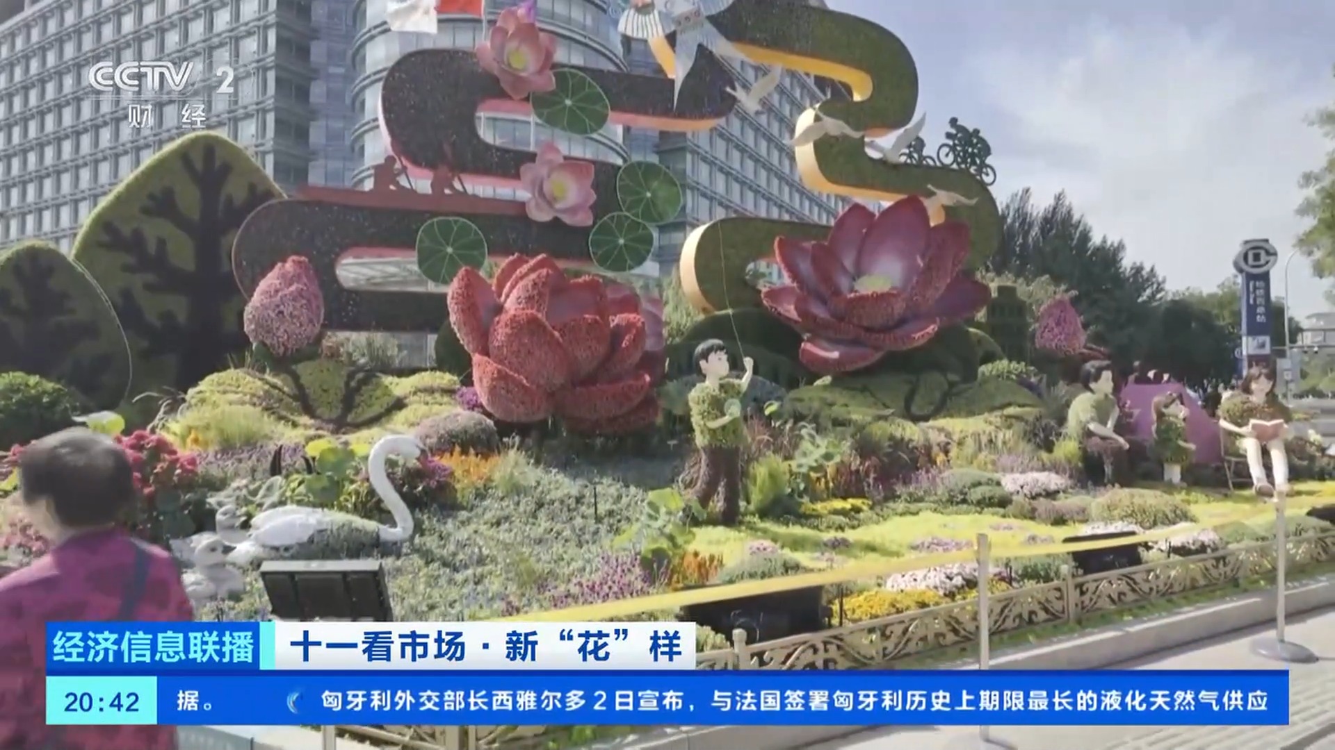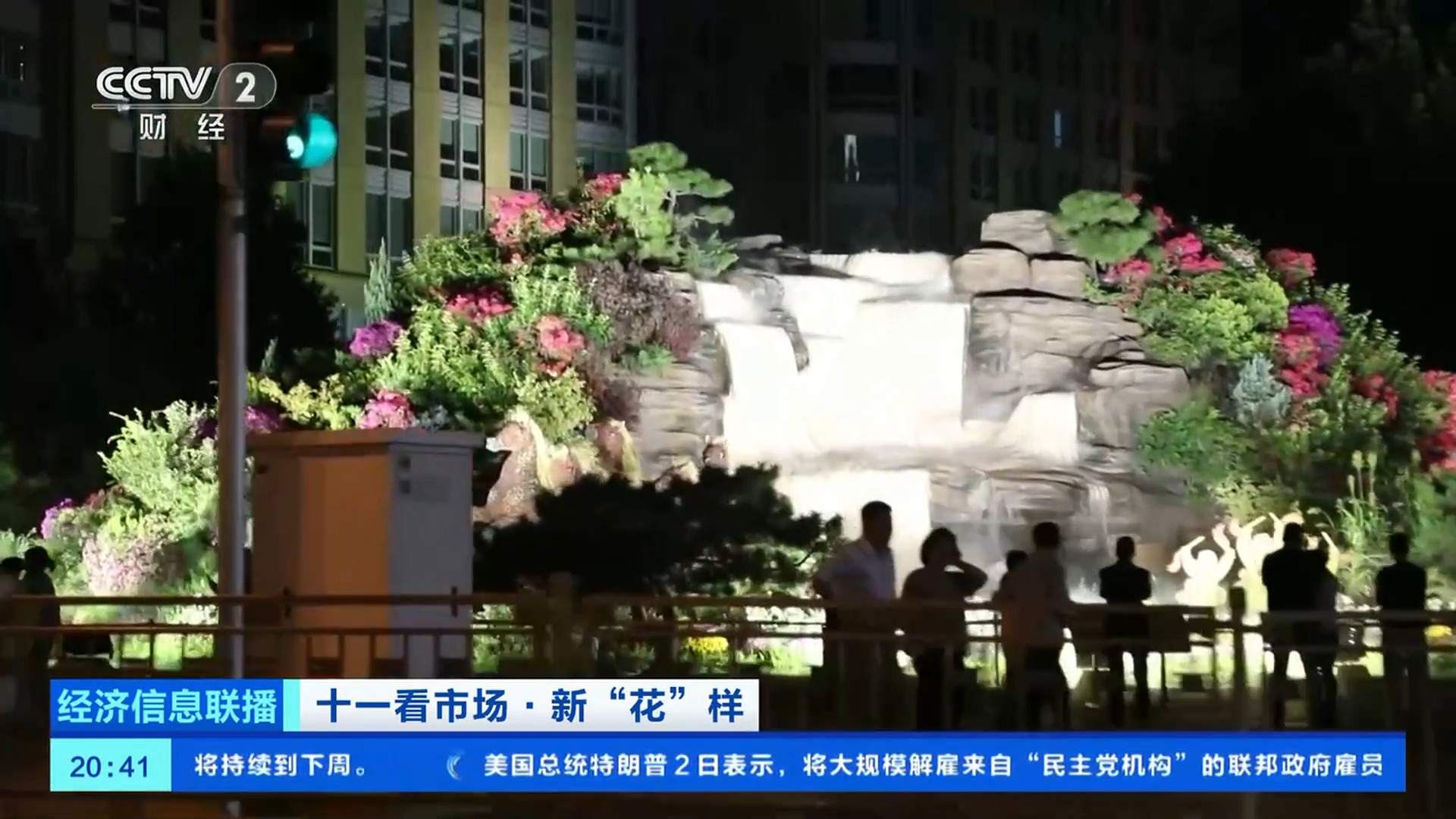 總臺(tái)央視記者 王聞聰:今年北京天安門(mén)廣場(chǎng)中心花壇的大花籃和長(zhǎng)安街沿線的10組立體花壇,都在國(guó)慶中秋假期增添了夜間照明設(shè)施,讓夜晚的花壇更加引人注目。北京東單東南角的“黃河贊歌”立體花壇,也被稱(chēng)為是“會(huì)唱歌的花壇”。在花壇上不僅能看到微觀的壺口瀑布、奔騰的駿馬、載歌載舞的人群,還有水霧、音樂(lè)等聲光電技術(shù),更加逼真地還原了黃河之水天上來(lái)的氣勢(shì)。晚上八點(diǎn),這里仍有大量游客前來(lái)拍照打卡。