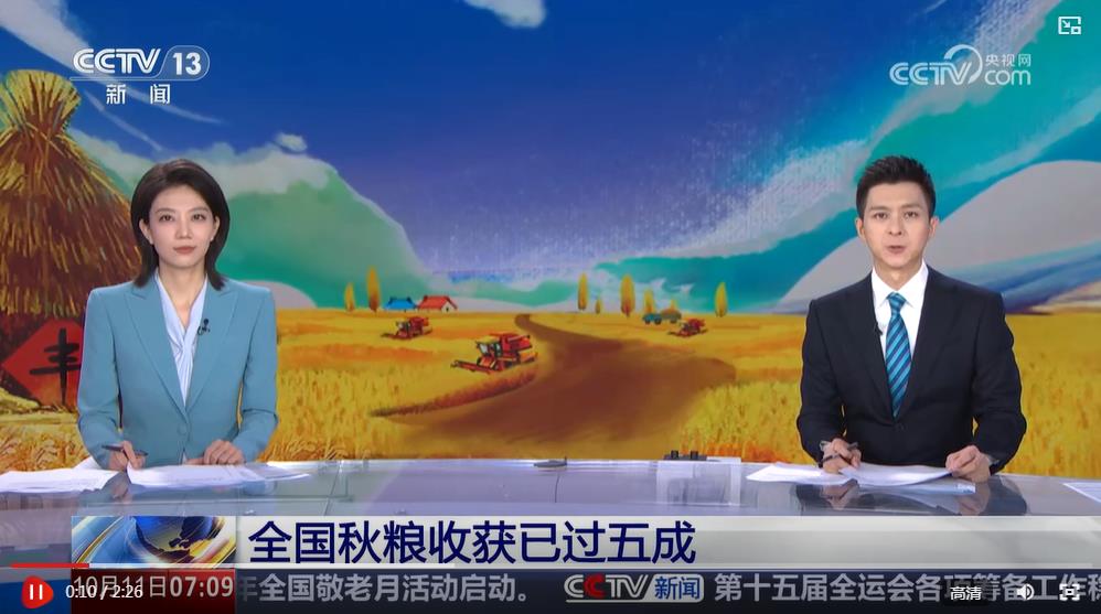 央視網消息:據農業農村部最新消息,截至10月10日,全國秋糧收獲已過五成。分作物看,中稻收獲近六成,玉米過五成,大豆五成半,雙季晚稻零星收獲。