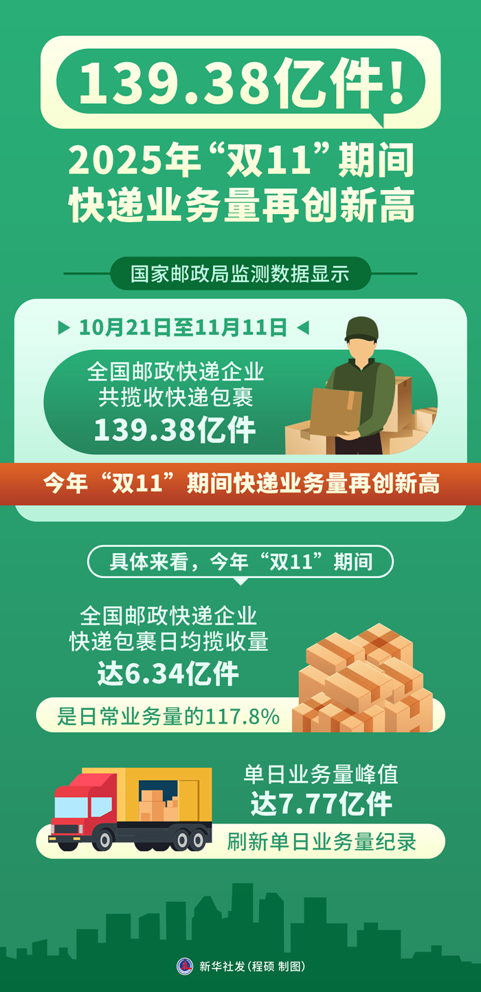 新華社北京11月12日電(記者葉昊鳴)記者11月12日從國家郵政局獲悉,國家郵政局監測數據顯示,10月21日至11月11日,全國郵政快遞企業共攬收快遞包裹139.38億件,今年“雙11”期間快遞業務量再創新高。