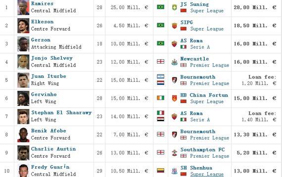 截至目前,中國俱樂部球員轉會費(含轉入及轉出)排名前10位的分別是拉米雷斯(2800萬歐元)、埃爾克森(1850萬歐元)、熱爾維尼奧(1500萬歐元)、高拉特(1500萬歐元)、保利尼奧(1400萬歐元)、登巴巴(1300萬歐元)、瓜林(1200萬歐元)、吉安(1200萬歐元)、畢津浩(1114萬歐元)、阿蘭(1110萬歐元),1100萬歐元轉會費的球員進不了前10位,這在一年之前是不可想象的。而像格烏瓦尼奧(1100萬歐元)、張鷺(980萬歐元)、孫可(920萬歐元)、巴里奧斯(850萬歐元)、吉爾(850萬歐元)、孔卡(820萬歐元)、奧古斯托(800萬歐元)、蒙蒂略(750萬歐元)、迪亞曼蒂(690萬歐元)都被擠出了前10位。