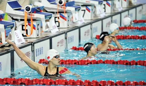 4 月16 日,在太原進(jìn)行的2018 年全國游泳冠軍賽暨亞運(yùn)會(huì)選拔賽女子100 米仰泳預(yù)賽中,浙江隊(duì)選手傅園慧以1 分00 秒83 的成績晉級(jí)決賽。圖為傅園慧(下)在賽后查看比賽成績。