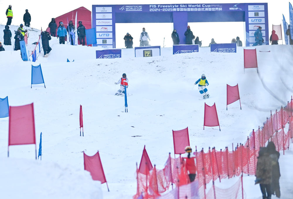 2月22日,2024-2025賽季國際雪聯自由式滑雪世界杯(北大湖站)雪上技巧女子雙人比賽在吉林市北大湖滑雪度假區舉行。新華社記者 顏麟蘊 攝