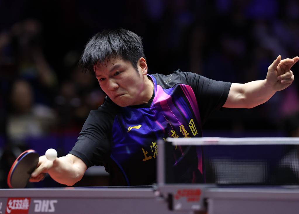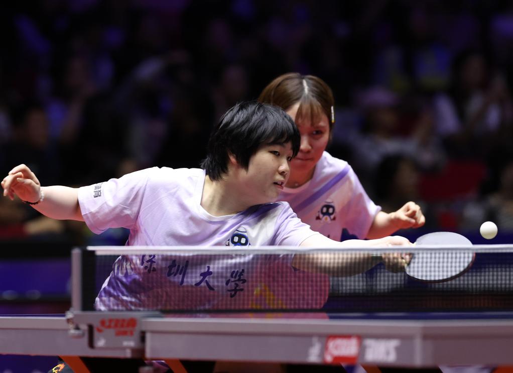 6月11日,樊振東在比賽中回球。新華社記者 楊世堯 攝 當天上午,上海地產集團迎戰黃石基地·華新。首場比賽周愷/趙子豪不敵向鵬/薛飛。樊振東出戰一單,和林詩棟獻上一場高質量對決。雙方經歷四局苦戰后,第五局最后階段,樊振東率先拿到賽點,以11:8勝出。隨后兩場,周愷和樊振東分別戰勝各自對手,上海地產集團大比分3:1逆轉取勝。 當晚上海地產集團與山東魏橋·向尚運動碰面。首場趙子豪/趙釗彥0:3不敵周啟豪/林昀儒,樊振東坐鎮一單順利贏下黃友政,但隊友趙子豪和趙釗彥先后負于林昀儒和黃友政,上海地產集團大比分1:3告負,目送對手本階段六連勝。 賽后林昀儒說:“今天雙打和周啟豪是第二次搭檔了,發揮比之前更好一些,進攻和控制方面都不錯,比賽狀態比前一天更好。周啟豪、梁靖崑、王楚欽這些隊友都很強,給了自己很多自信。” 當晚的女團焦點戰中,深圳大學力克華東理工大學。孫穎莎繼續休戰,蒯曼和平野美宇扛起大旗,她們先是搭檔橫掃了張翔宇/王曉彤,之后單打戰勝各自對手。王藝迪3:1挑落覃予萱,無力改變局面,深圳大學大比分3:1取勝。