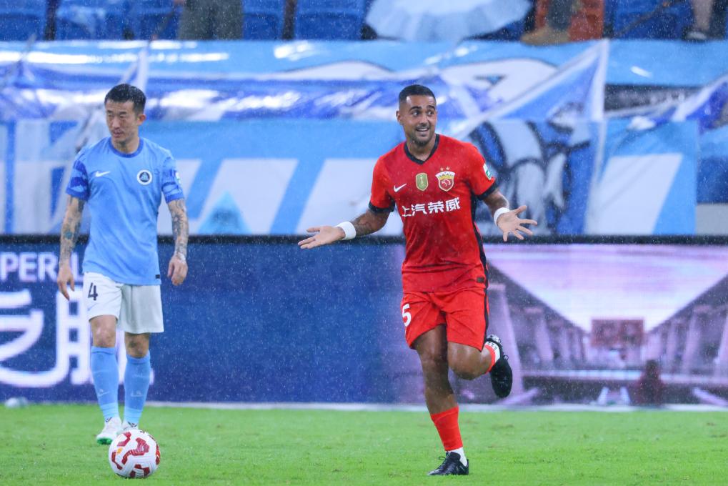 6月30日,上海海港隊球員萊昂納多(右)在比賽中慶祝進球。新華社發(彭志剛 攝)