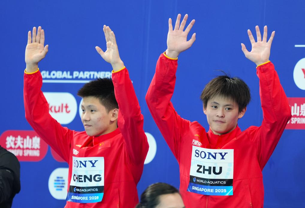 新華社新加坡7月29日電(記者岳晨星、王子江)2025年世界游泳錦標賽跳水項目29日在新加坡繼續進行,中國隊陳藝文/陳佳、程子龍/朱子鋒分別奪得女子雙人3米板和男子雙人10米臺金牌。 女子雙人3米板決賽中,剛剛搭檔不久的陳藝文/陳佳展現出良好的默契和狀態,從第一跳開始就保持領先,最終以325.20分摘得金牌。英國組合哈珀/米尤-詹森以298.35分收獲銀牌,年僅14歲的墨西哥雙胞胎庫埃瓦·洛瓦托姐妹拿到銅牌。