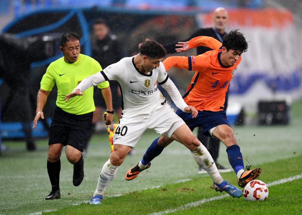 10月17日,上海海港隊球員吾米提江·玉蘇普(前左)在比賽中與青島海牛隊球員買烏郎·米吉提拼搶。當日,在山東青島舉行的2025賽季中超聯賽第27輪比賽中,上海海港隊客場4:3戰勝青島海牛隊。新華社記者 李紫恒 攝