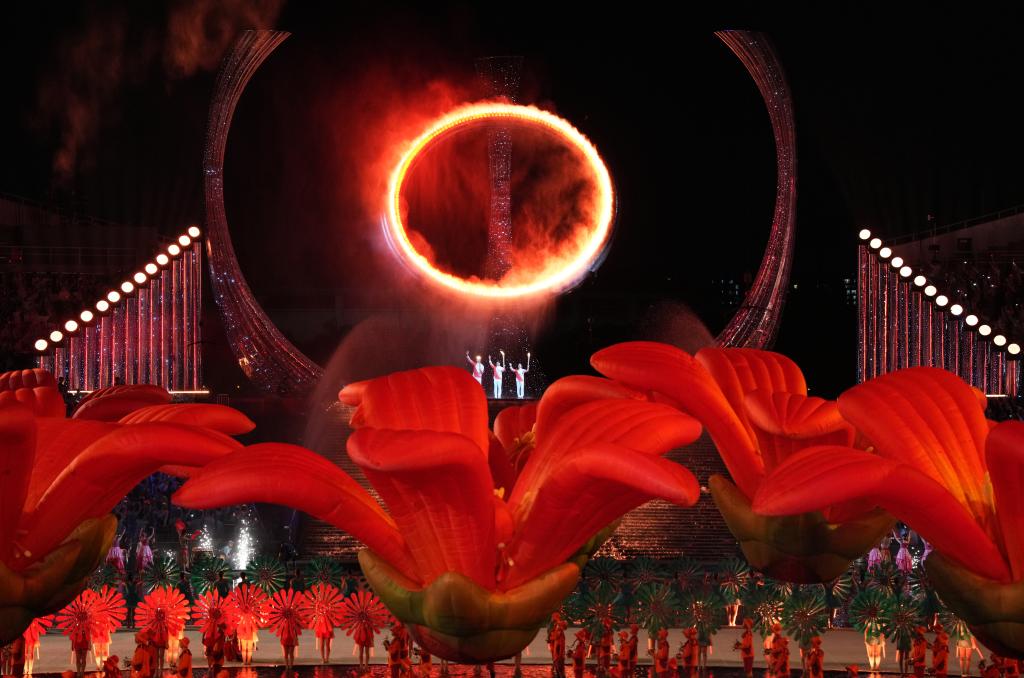 新華社廣州11月10日電(記者王浩明、趙紫羽、田宇)9日晚,廣東奧林匹克體育中心,十五運會的開幕式在這里舉行,當十五運會主火炬塔“天海之冠”被三地健兒共同點亮那一剎,燈火輝煌,掌聲雷動。