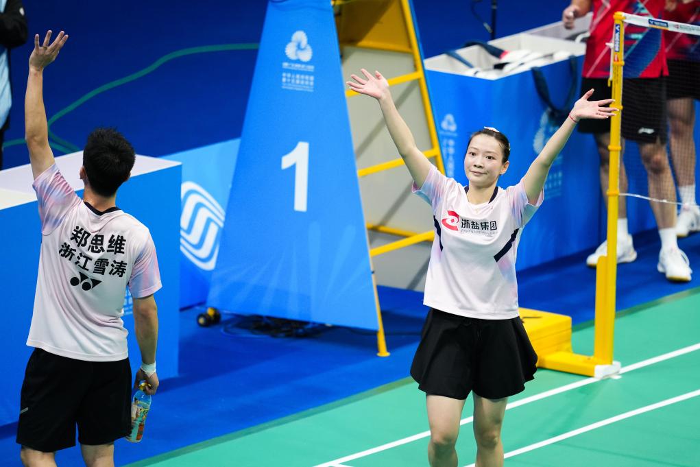 11月20日,浙江隊組合鄭思維/黃雅瓊(右)在奪冠后向觀眾致意。新華社記者 陳思汗 攝