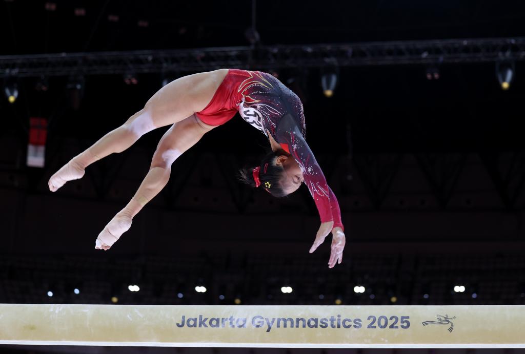 10月25日,中國選手張清穎在2025年國際體操聯合會(FIG)競技體操世錦賽女子平衡木決賽中奪得冠軍。新華社記者 白雪飛 攝