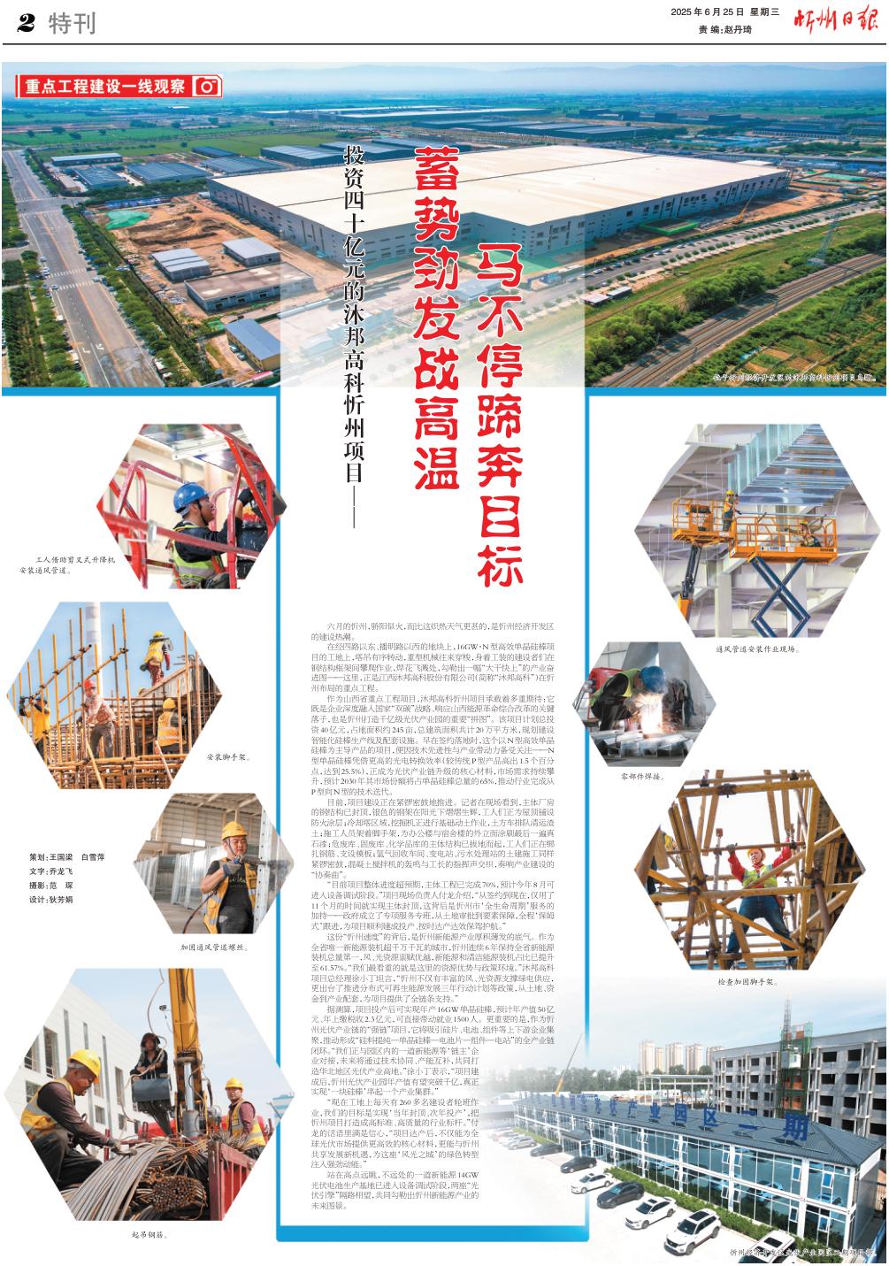 在經(jīng)四路以東、播明路以西的地塊上,16GW·N型高效單晶硅棒項目的工地上,塔吊有序轉(zhuǎn)動,重型機械往來穿梭,身著工裝的建設者們在鋼結構框架間攀爬作業(yè),焊花飛濺處,勾勒出一幅“大干快上”的產(chǎn)業(yè)奮進圖——這里,正是江西沐邦高科股份有限公司(簡稱“沐邦高科”)在忻州布局的重點工程。