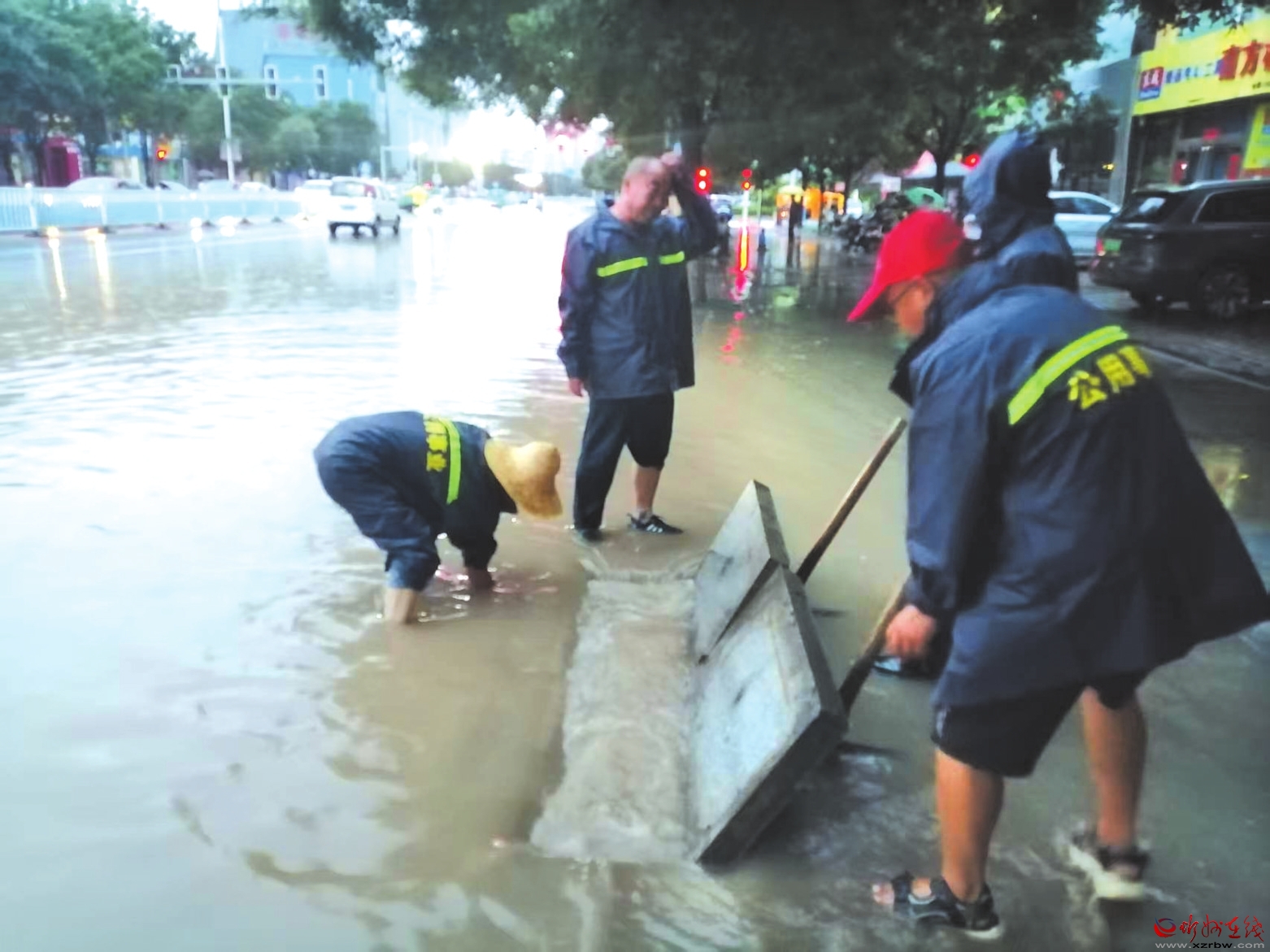 市城市管理局干部職工清理被堵塞的排水井口。本報記者 張志遠攝