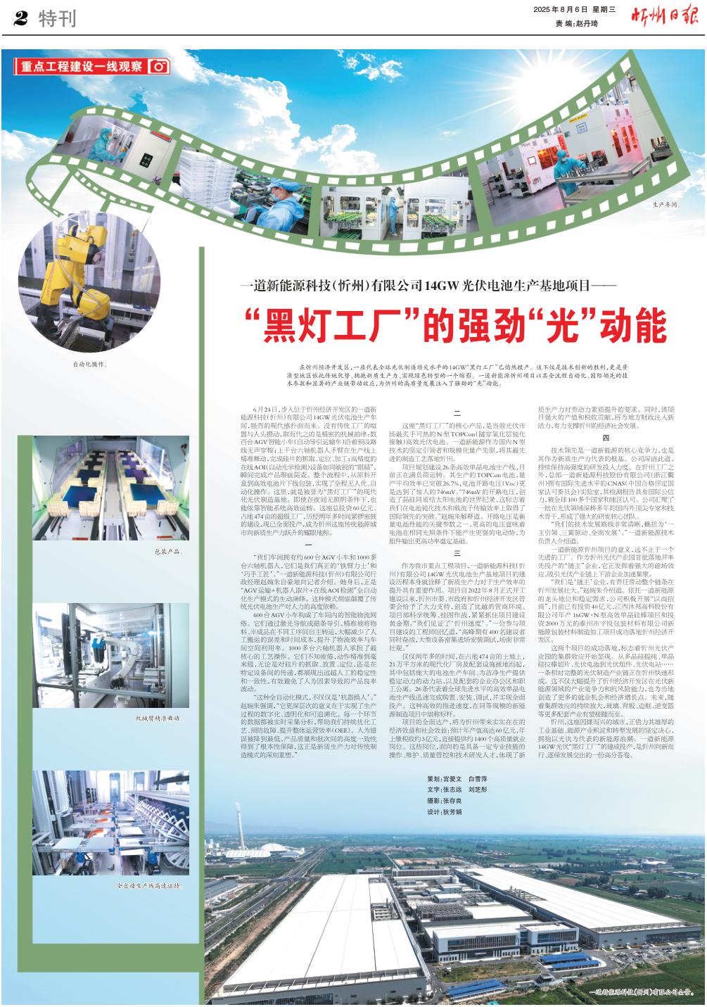 在忻州經(jīng)濟開發(fā)區(qū),一座代表全球光伏制造頂尖水平的14GW“黑燈工廠”已悄然投產(chǎn)。這不僅是技術創(chuàng)新的勝利,更是資源型地區(qū)依托傳統(tǒng)優(yōu)勢、擁抱新質生產(chǎn)力、實現(xiàn)綠色轉型的一個縮影。一道新能源忻州項目以其全流程自動化、國際領先的技術參數(shù)和顯著的產(chǎn)業(yè)鏈帶動效應,為忻州的高質量發(fā)展注入了強勁的“光”動能。 6月24日,步入位于忻州經(jīng)濟開發(fā)區(qū)的一道新能源科技(忻州)有限公司14GW光伏電池生產(chǎn)車間,強烈的現(xiàn)代感撲面而來。沒有傳統(tǒng)工廠的喧囂與人頭攢動,取而代之的是精密的機械韻律:數(shù)百臺AGV智能小車(自動導引運輸車)沿著預設路線無聲穿梭;上千臺六軸機器人手臂在生產(chǎn)線上精準舞動,完成硅片的抓取、定位、加工;高精度的在線AOI(自動光學檢測)設備如同敏銳的“眼睛”,瞬間完成產(chǎn)品瑕疵篩查。整個流程中,從原料開盒到高效電池片下線包裝,實現(xiàn)了全程無人化、自動化操作。這里,就是被譽為“黑燈工廠”的現(xiàn)代化光伏制造基地。即使在夜間無照明條件下,也能依靠智能系統(tǒng)高效運轉。這座總投資60億元、占地474畝的超級工廠,歷經(jīng)兩年多時間緊鑼密鼓的建設,現(xiàn)已全面投產(chǎn),成為忻州這座傳統(tǒng)能源城市向新質生產(chǎn)力躍升的耀眼地標。 一 “我們車間擁有約600臺AGV小車和1000多臺六軸機器人,它們是我們真正的‘鐵臂力士’和‘巧手工匠’?!币坏佬履茉纯萍迹ㄐ弥荩┯邢薰拘姓?jīng)理趙婉朱自豪地向記者介紹。她身后,正是“AGV運輸+機器人取片+在線AOI檢測”全自動化生產(chǎn)模式的生動演繹。這種模式徹底顛覆了傳統(tǒng)光伏電池生產(chǎn)對人力的高度依賴。 600臺AGV小車構成了車間內(nèi)的智能物流網(wǎng)絡。它們通過激光導航或磁條導引,精準地將物料、半成品在不同工序間自主轉運,大幅減少了人工搬運的誤差和時間成本,提升了物流效率與車間空間利用率。1000多臺六軸機器人承擔了最核心的工藝操作。它們不知疲倦,動作精準到毫米級,無論是對硅片的抓取、放置、定位,還是在特定設備間的傳遞,都展現(xiàn)出遠超人工的穩(wěn)定性和一致性,有效避免了人為因素導致的產(chǎn)品良率波動。 “這種全自動化模式,不僅僅是‘機器換人’?!壁w婉朱強調,“它更深層次的意義在于實現(xiàn)了生產(chǎn)過程的數(shù)字化、透明化和可追溯化。每一個環(huán)節(jié)的數(shù)據(jù)都被實時采集分析,幫助我們持續(xù)優(yōu)化工藝、預防故障、提升整體運營效率(OEE)。人為錯誤被降到最低,產(chǎn)品質量和批次間的高度一致性得到了根本性保障,這正是新質生產(chǎn)力對傳統(tǒng)制造模式的深刻重塑。” 二 這座“黑燈工廠”的核心產(chǎn)品,是當前光伏市場最炙手可熱的N型TOPCon(隧穿氧化層鈍化接觸)高效光伏電池。一道新能源作為國內(nèi)N型技術的堅定引領者和規(guī)?;慨a(chǎn)先驅,將其最先進的制造工藝落地忻州。 項目規(guī)劃建設26條高效單晶電池生產(chǎn)線,目前正在滿負荷運轉。其生產(chǎn)的TOPCon電池,量產(chǎn)平均效率已突破26.7%,電池開路電壓(Voc)更是達到了驚人的746mV。“746mV的開路電壓,創(chuàng)造了晶硅同質結太陽電池的世界紀錄,這標志著我們在電池鈍化技術和載流子傳輸效率上取得了國際領先的突破?!壁w婉朱解釋道。開路電壓是衡量電池性能的關鍵參數(shù)之一,更高的電壓意味著電池在相同光照條件下能產(chǎn)生更強的電動勢,為組件輸出更高功率奠定基礎。 三 作為我市重點工程項目,一道新能源科技(忻州)有限公司14GW光伏電池生產(chǎn)基地項目的建設歷程本身就詮釋了新質生產(chǎn)力對于生產(chǎn)效率的提升具有重要作用。項目自2022年8月正式開工建設以來,忻州市委、市政府和忻州經(jīng)濟開發(fā)區(qū)管委會給予了大力支持,創(chuàng)造了優(yōu)越的營商環(huán)境。項目部科學統(tǒng)籌、掛圖作戰(zhàn),緊緊抓住項目建設黃金期?!拔覀円娮C了‘忻州速度’?!币晃粎⑴c項目建設的工程師回憶道,“高峰期有400名建設者同時奮戰(zhàn),大型設備密集進場安裝調試,場面非常壯觀。” 僅僅兩年多的時間,在占地474畝的土地上,21萬平方米的現(xiàn)代化廠房及配套設施拔地而起,其中包括龐大的電池生產(chǎn)車間、為潔凈生產(chǎn)提供穩(wěn)定動力的動力站,以及配套的企業(yè)辦公區(qū)和職工公寓。26條代表著全球先進水平的高效單晶電池生產(chǎn)線迅速完成購置、安裝、調試,并實現(xiàn)全面投產(chǎn)。這種高效的推進速度,在同等規(guī)模的新能源制造項目中堪稱標桿。 項目的全面達產(chǎn),將為忻州帶來實實在在的經(jīng)濟效益和社會效益:預計年產(chǎn)值高達60億元,年上繳稅收約3億元,直接提供約1400個高質量就業(yè)崗位。這些崗位,面向的是具備一定專業(yè)技能的操作、維護、質量管控和技術研發(fā)人才,體現(xiàn)了新質生產(chǎn)力對勞動力素質提升的要求。同時,該項目強大的產(chǎn)值和稅收貢獻,將為地方財政注入新活力,有力支撐忻州的經(jīng)濟社會發(fā)展。 四 技術領先是一道新能源的核心競爭力,也是其作為新質生產(chǎn)力代表的根基。公司深諳此道,持續(xù)保持高強度的研發(fā)投入