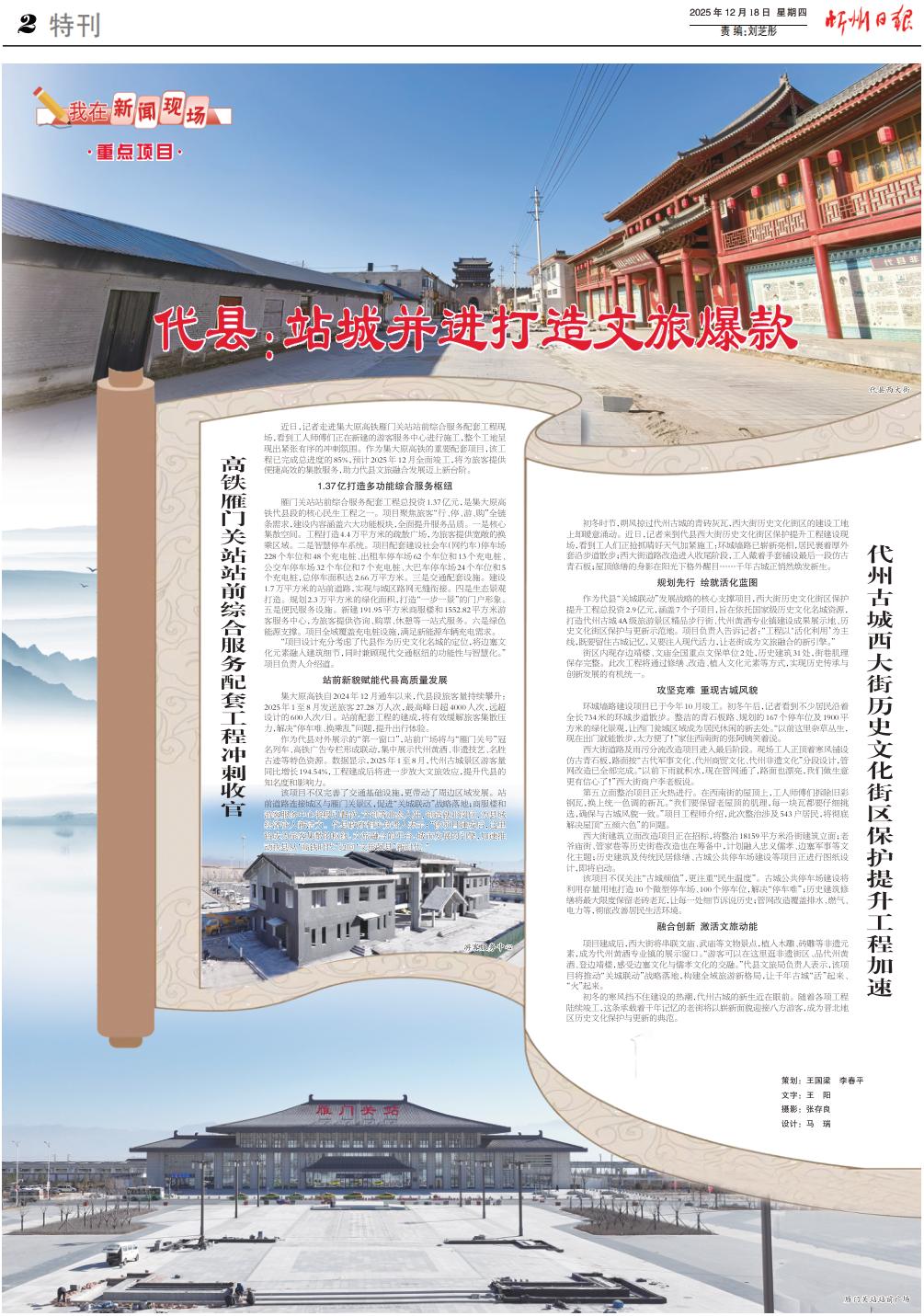 作為代縣對外展示的“第一窗口”,站前廣場將與“雁門關號”冠名列車、高鐵廣告專欄形成聯動,集中展示代州黃酒、非遺技藝、名勝古跡等特色資源。數據顯示,2025年1至8月,代州古城景區游客量同比增長194.54%,工程建成后將進一步放大文旅效應,提升代縣的知名度和影響力。