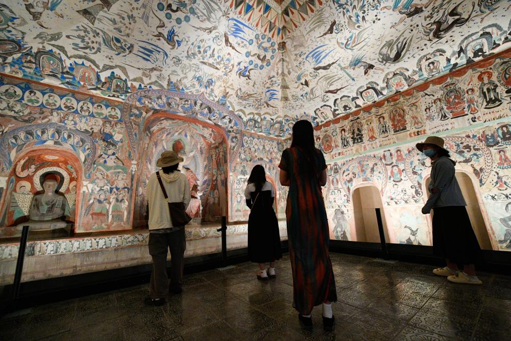 2024年6月7日,在敦煌石窟文物保護研究陳列中心,游客參觀莫高窟復制洞窟第276窟壁畫。新華社記者 郎兵兵 攝 “莫高窟無疑是敦煌最具標志性的瑰寶,這里是世界上現存歷史最悠久、規模最宏大、內容最豐富、保存最完整的佛教藝術寶庫之一,被譽為‘大漠里的藝術館’。”蘭州大學敦煌學研究所所長鄭炳林說。