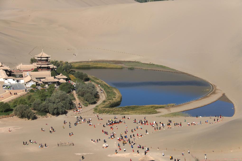 2024年10月3日,游客在甘肅省敦煌市鳴沙山月牙泉景區游覽。張曉亮 攝 “來一次就會愛上。” 月牙泉是沙漠的眼睛,依舊倒映著漢唐的明月。駝隊曾經從這里經過,駝鈴聲串起長安與羅馬的夢。絲綢是流動的彩虹,瓷器是凝固的月光,經卷里藏著智慧的種子,在歐亞大陸上生根發芽。 “在這里游客不僅可以欣賞大漠風光,體驗絲路風情,還可以品味莫高神韻,感悟敦煌文化。”敦煌市文體廣電和旅游局副局長楊紅說。