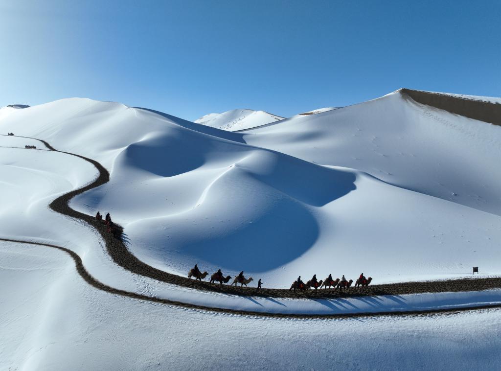 2023年11月15日拍攝的甘肅省敦煌市鳴沙山月牙泉景區雪景。張曉亮 攝 “來一次就會愛上。” 玉門關外,詩歌的種子早已隨風飄散,在邊塞詩人的筆下開出思念的花。而今,古樸雋秀的城市風貌、香氣撲鼻的特色美食、玲瑯滿目的沙洲夜市、豐富多彩的民俗風情……吟唱的曲調里,更多了生生不息的希望。