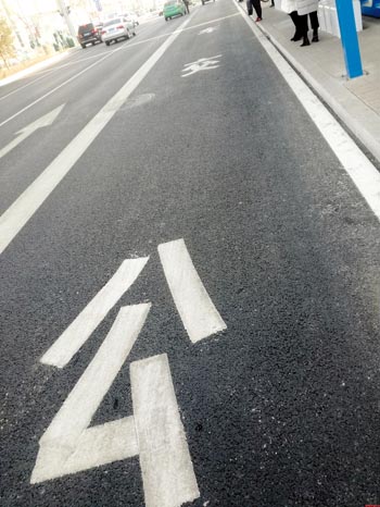 圖為城區長征中街(君華新天地對面)一公交站牌處,印在路面上的“公交車”三個字順序錯誤。正常閱讀順序是從上至下,從左至右,希望相關部門更正。一網友攝