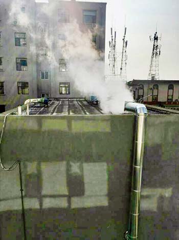 圖為城區榮鈺苑小區院內一飯店,四個排氣煙筒發出的噪音讓小區周邊居民無法正常休息,排放出的油煙散發出嗆人的味道,住戶沒法開窗戶,希望相關部門管理。一網友攝