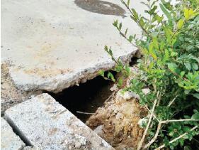 城區慕山南路樊野村西北人行道(路燈050號桿右側),因下雨出現了路基進水,雨水沖出一個大洞,影響道路安全,希望相關部門及時處理,避免隱患擴大。一網友攝