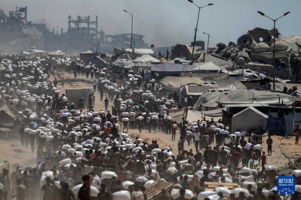 7月27日,在加沙地帶北部城鎮拜特拉希亞,人們領取通過邊境口岸進入加沙的援助物資。新華社發(里澤克·阿卜杜勒賈瓦德攝)