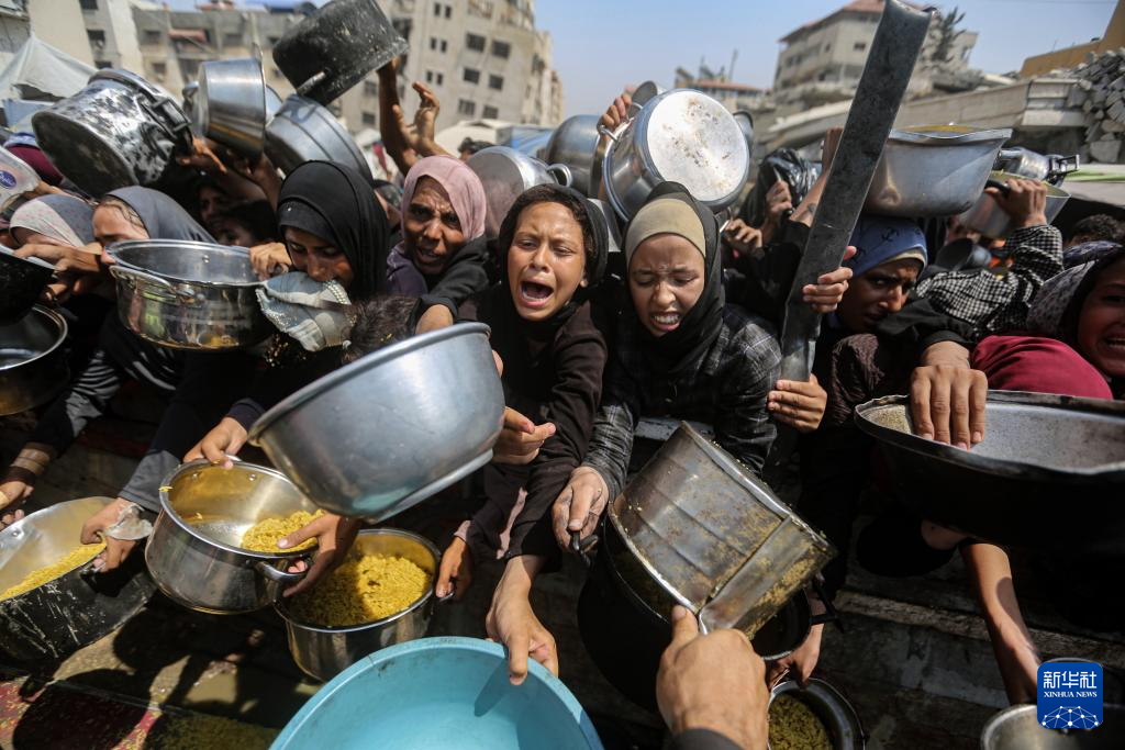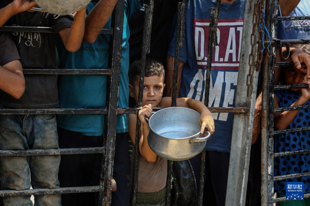 8月2日,流離失所的巴勒斯坦人在加沙城等待領取食物。新華社發(里澤克·阿卜杜勒賈瓦德攝)