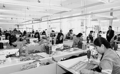 4月16日,河曲縣職業教育中心服裝加工車間里技術工人正在加班加點趕制夏季服飾。為促進貧困勞動力轉移就業,該縣職教中心去年引進江蘇省常熟市祥鼎祥服飾有限公司,并與之簽訂校企合作協議,有效帶動農村貧困勞動力轉移就業。目前已有83名經過培訓的農村貧困婦女成為服裝加工技術工人,月收入2000多元。(鄔耿杰 攝)