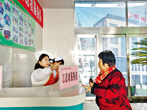 本報訊(實習記者 王菲)“大姐,您是哪里不舒服?”“我是來做檢查的,慢性病是在哪看呢?”“這個不在咱們這棟樓,我陪您過去吧。”在忻州市中心醫院的門診大廳,一位大姐看到大廳里人來人往,不知道該到幾樓找哪位醫生看病,志愿者見狀,快步走上前去,面帶微笑地與大姐打招呼,并很快帶著大姐去了就診區。