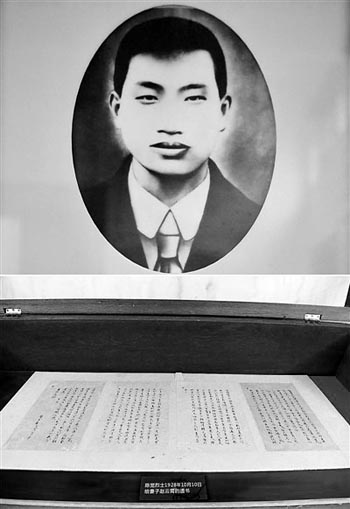 圖為拼版照片。上圖為陳覺像;下圖為湖南省長沙市烈士公園展出的陳覺烈士寫給妻子趙云霄的遺書(5月7日攝)。新華社發