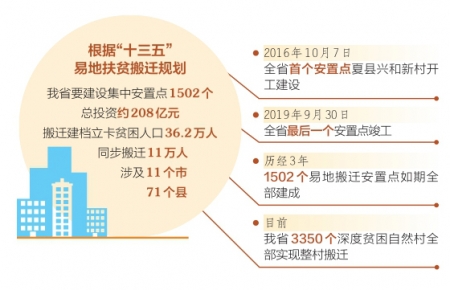 “十三五”易地扶貧搬遷啟動以來,我省有36.2萬貧困人口告別山莊窩鋪,搬進了公共設施配套齊全、產業就業措施完善的1502個易地扶貧搬遷集中安置點,這些安置點已成為貧困群眾穩定脫貧的新起點、走向全面小康的新支點、實現鄉村振興的新亮點。