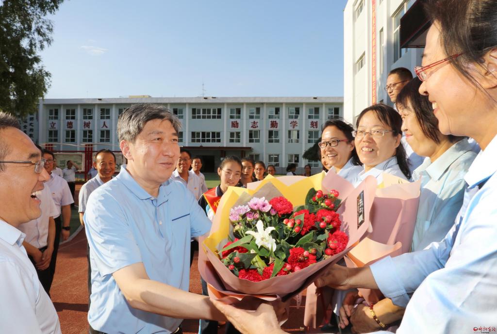 每到一處,朱曉東都向教師們致以節日問候。長征小學西校區是一所高標準規劃、高水平建設的新建學校,今年秋季學期投入使用。朱曉東察看電子圖書閱覽等教學新設施,了解學校開設的書法、歌唱、手工、足球、乒乓球、跆拳道、機器人組裝等特色教育課程,隨機檢查學生飲用水機具,向從基層選拔聘用的優秀教師代表贈送書籍,勉勵大家珍惜崗位,肩負起時代賦予的重任,全心全意培養好人才。具有40多年歷史的忻州六中辦學底蘊厚重,近年來與時俱進提升教學能力。朱曉東實地了解學校發展情況后,一一為教師代表獻上鮮花,感謝大家辛勤付出,希望學校越辦越好,讓孩子們在學校有更多收獲。忻州高級中學教學設施先進,教師隊伍素質高、經驗豐富,今年學校畢業班高考再次取得好成績。朱曉東詳細了解學校歷史和往屆學生成就,鼓勵教師們放長眼光,對照更高標準繼續努力,為忻州增光添彩。