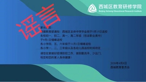 近日,“北京高三4月27日開學,六年級和初三5月11日開學” 、“西城區全體中學畢業班5月15日返校”、“北京某區教委接到通知,確認9月1日前不會復學”等一系列消息在網上流傳。