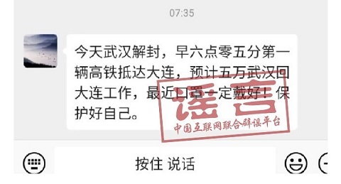 4月8日,有消息稱:“今天武漢解封,早六點零五分第一輛高鐵抵達大連,預計五萬武漢人回大連工作,最近口罩一定戴好……”。