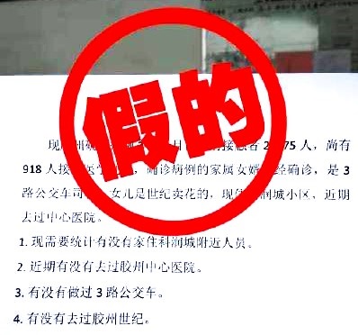 近日,有關青島新增兩名確診病例的信息在網上流傳,稱“膠州密切接觸者21375人,尚有918人接受醫學觀察”、“患者女婿是3路公交車司機!已經確診了”等。
