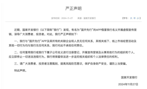 詳情:近期,有名為“國開先行”的APP假冒國家開發銀行名義開展虛假宣傳營銷,誤導廣大消費者、投資者。對此,國家開發銀行于11月27日在官網發布《嚴正聲明》:
