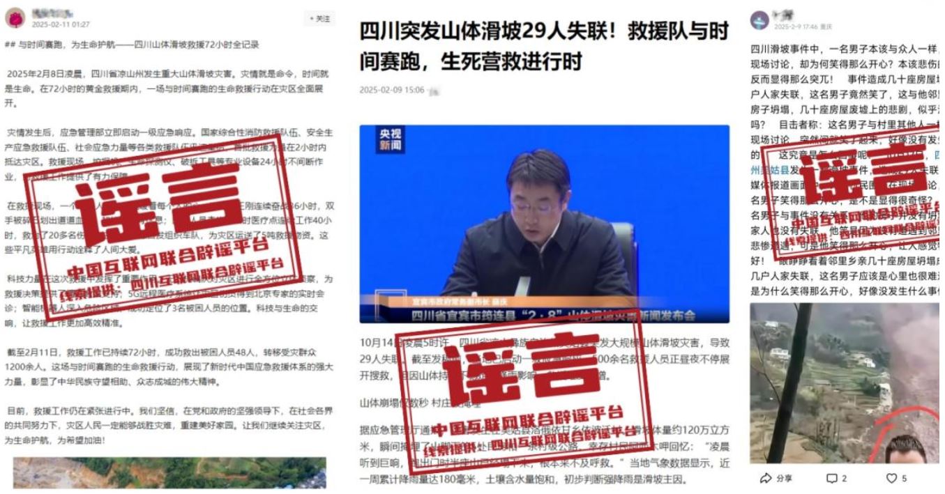 詳情:2025年2月8日,四川宜賓筠連發生山體滑坡已造成1人遇難、28人失聯,2人受傷。全民救援關鍵時刻,部分網民為吸引流量博取關注,在網上捏造不實信息、散布災情謠言、混淆大眾視聽,不僅擾亂了社會公共秩序,更對救援工作造成困擾。