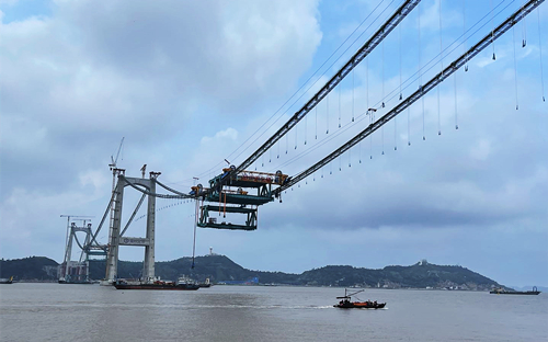 “大橋主梁最大節(jié)段重量達(dá)到813噸,國內(nèi)現(xiàn)有纜載吊機(jī)根本無法滿足單臺(tái)起吊需求。”潘濟(jì)向記者表示,為解決這一難題,項(xiàng)目創(chuàng)新研制國內(nèi)首套1000噸級(jí)纜載吊機(jī),搭載人機(jī)界面、傳感器技術(shù)、通訊技術(shù)等技術(shù),把安裝精度誤差控制在5毫米內(nèi),確保施工過程安全高效。