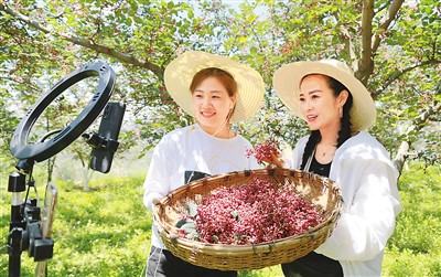 今年,甘肅省隴南市武都區的百萬畝花椒喜獲豐收,隴南市相關部門及時組織本土電商人才深入田間地頭,通過電商平臺和直播帶貨方式助農銷售。圖為日前,網絡主播在武都區郭河鄉候家彎村利用智能手機直播推介花椒。李旭春攝(人民視覺)