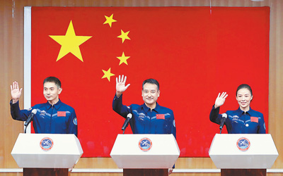 10月14日,執(zhí)行神舟十三號載人飛行任務的3名航天員翟志剛(中)、王亞平(右)、葉光富在酒泉衛(wèi)星發(fā)射中心問天閣與中外媒體記者集體見面。新華社記者 琚振華 攝