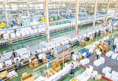 4月25日,在江蘇省宿遷市蘇宿工業(yè)園區(qū)的江蘇皓峰電器有限公司生產車間內,技術人員在生產加工銷往海內外市場的智能洗衣機。陳少帥攝(人民視覺)