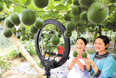 互聯網平臺互聯互通,將為電子商務從業者和消費者帶來更多便利。圖為日前,在貴州省黔東南苗族侗族自治州榕江縣仁里水族鄉通倒村羅漢果種植基地,工作人員在直播推介當地出產的羅漢果。李長華攝(人民視覺)