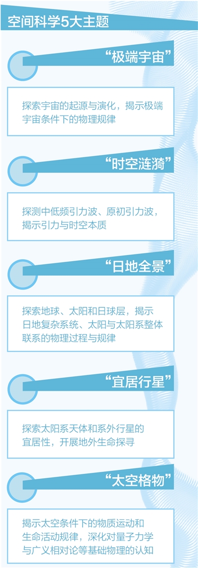 “太空格物”主題。主要是揭示太空條件下的物質運動和生命活動規律,深化對量子力學與廣義相對論等基礎物理的認知。優先發展方向包括微重力科學、量子力學與廣義相對論、空間生命科學等。