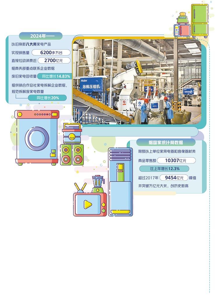 自《推動大規模設備更新和消費品以舊換新行動方案》(以下簡稱《行動方案》)實施以來,家電市場消費潛力得到顯著釋放。數據顯示,2024年,中央加力支持以舊換新八大類家電產品實現銷售量6200多萬臺,直接拉動消費近2700億元。日前,國家發展改革委副主任趙辰昕在國務院政策例行吹風會上介紹,2025年將延續并加力擴圍實施“兩新”政策,享受以舊換新補貼的家電產品種類由2024年的8類增至12類,單件最高補貼可達銷售價格的20%。