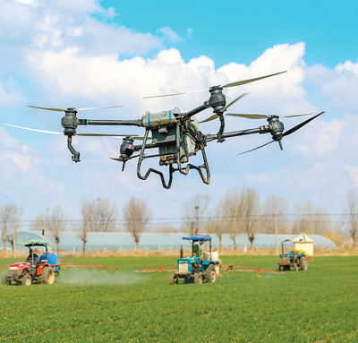 3月16日,山東青島萊西市沽河街道,植保無人機、長臂噴霧機在田間對小麥進行管護。張進剛攝(人民視覺)