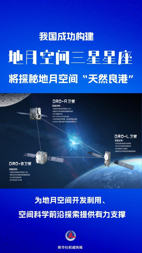 記者從中國科學院空間應用工程與技術中心獲悉,我國已成功構建由三顆衛星組成的地月空間三星星座,將聚焦地月空間遠距離逆行軌道(DRO)開展深入科學研究。